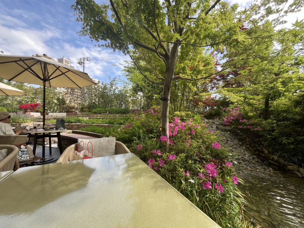 旧友とのランチの後、パティーナ大阪1階にありますバー&ダイニングP72に行ってきました。天気も良く新緑が美しい季節なのでガーデンテラスのお席でお茶しました。店内からも緑がしっかり見えますので、陽射しが強い時期は店内でお茶をしながら緑を楽しむことができますよ。