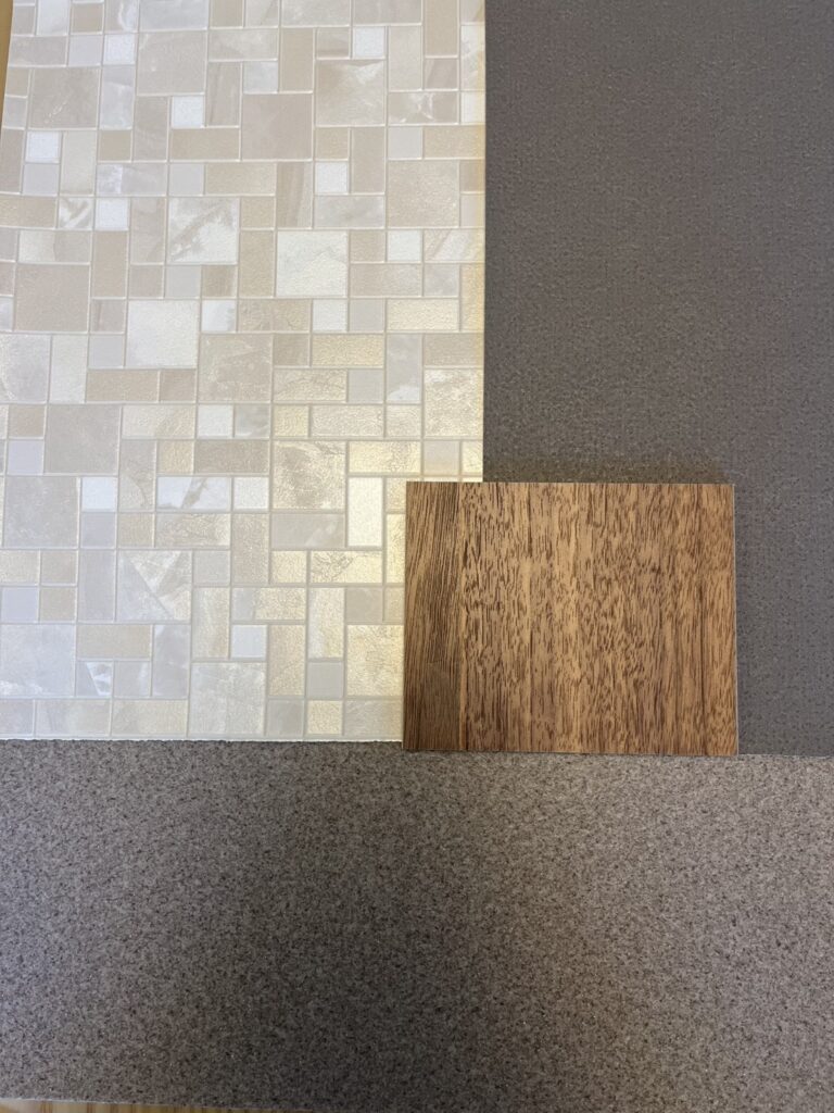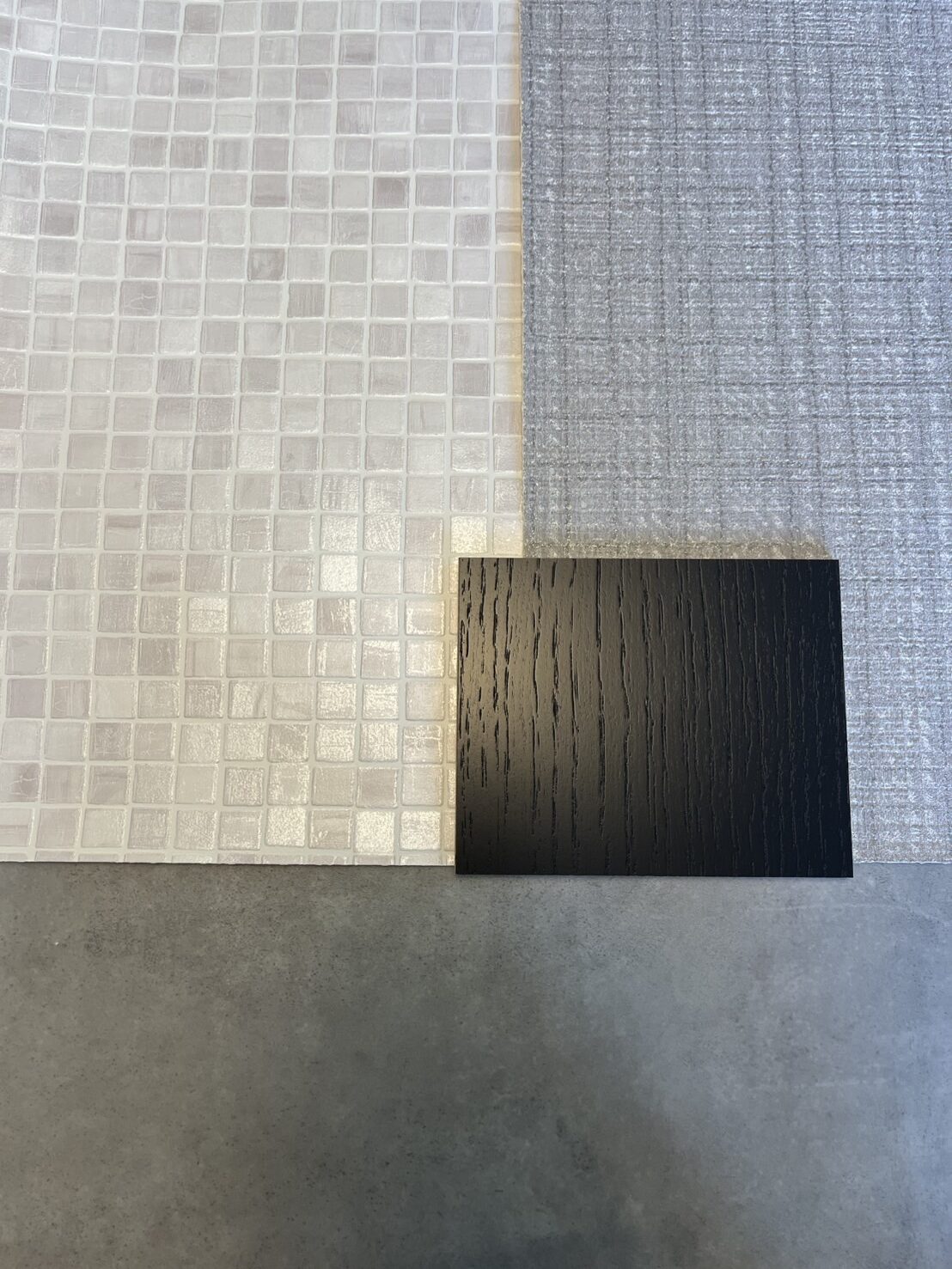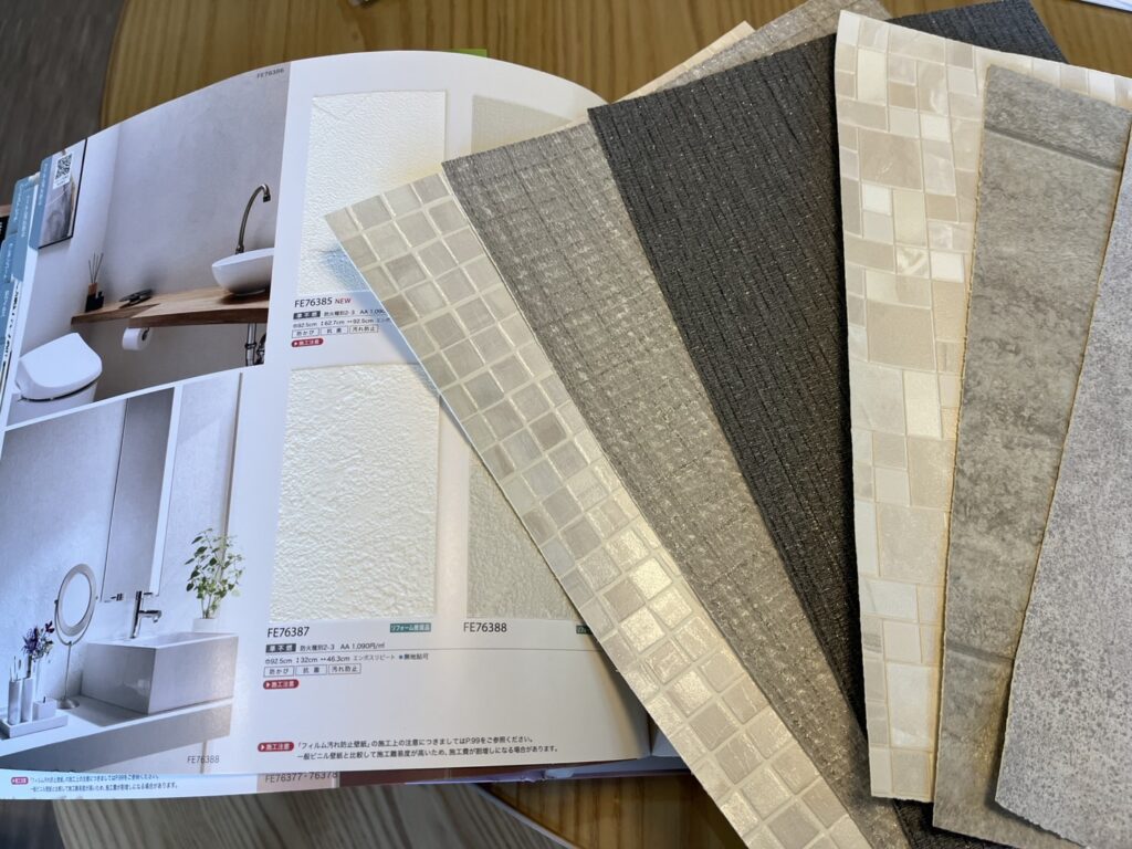 水回りのリフォームのプランニング中です。こちらはトイレの床、壁を考えています。お客様のご希望は、ホテルライクなトイレ。ブラック系やブラウン系のシックでかっこいい雰囲気になるよう考えていきたいと思います。