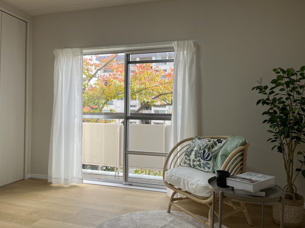 本日は1階の物件を2件ご案内しました。室内から見える桜の紅葉がとてもきれいでした。窓から自然が見える物件は癒されます。こちらの物件は弊社がフルリフォームいたしました。予算に合わせてインテリアコーディネータがアドバイス致します。是非ご相談下さい。
