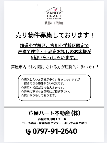 弊社のお客様は芦屋市内、ご近所でお引越しされたい方が多いです。またファミリー層では精道小学校や宮川小学校限定で探される方が多いです。現在、戸建て・土地ご希望の方が5組いらっしゃいます。また、マンションをお探しの方、とくにペット飼育可能なマンションをお探しの方が多く弊社に来られています。不動産の売却をご検討の方はどうぞよろしくお願い致します。